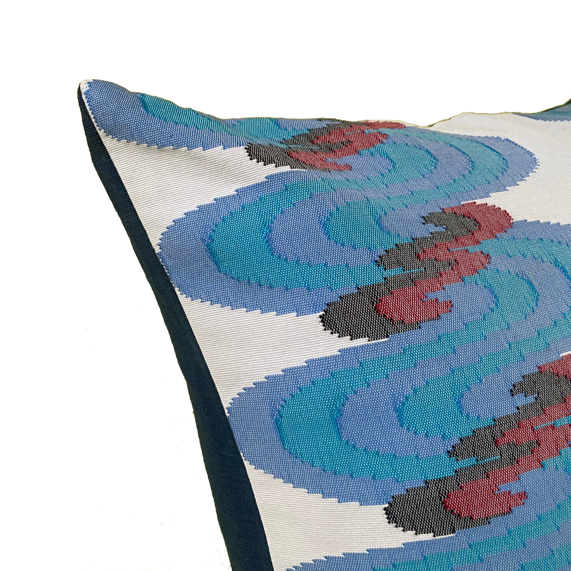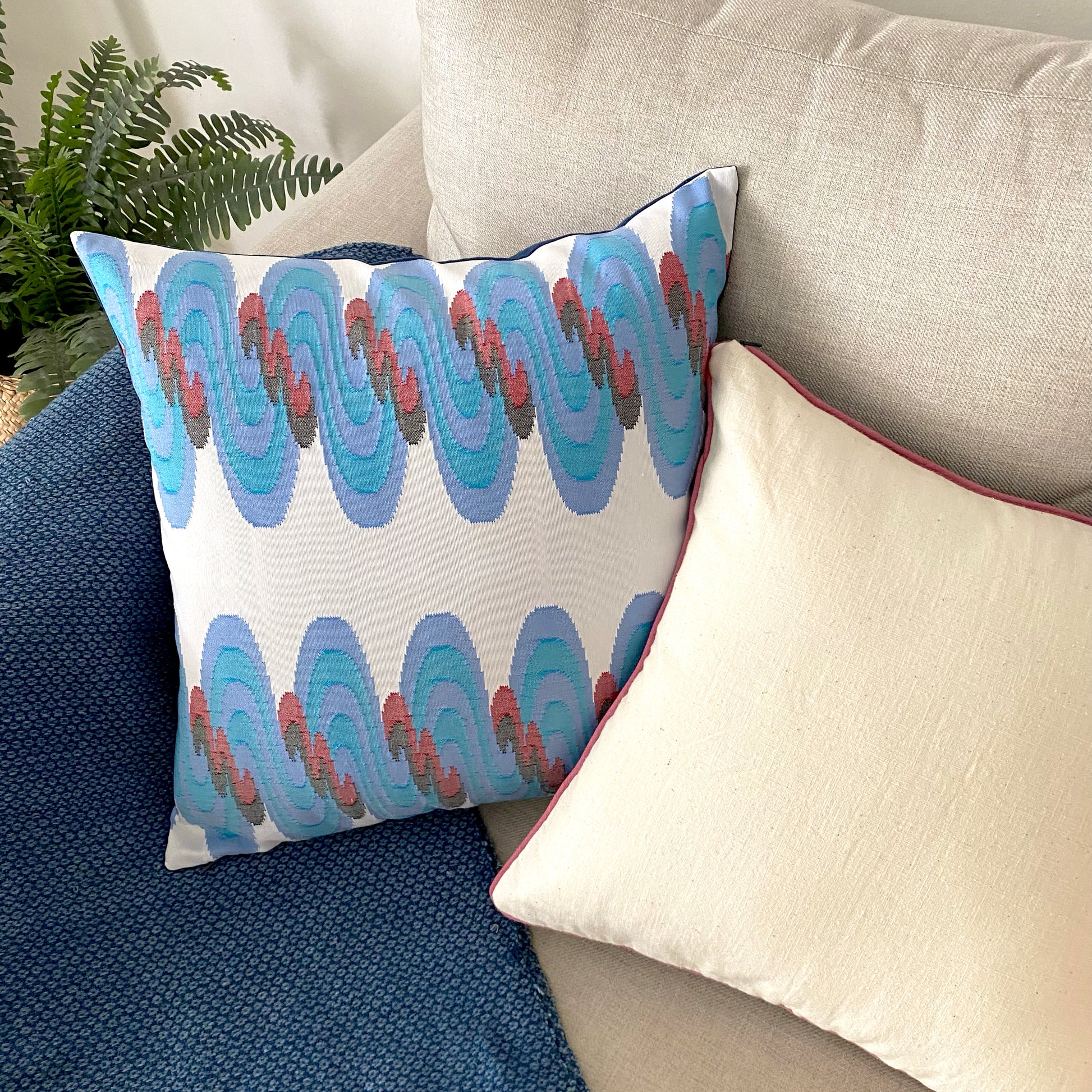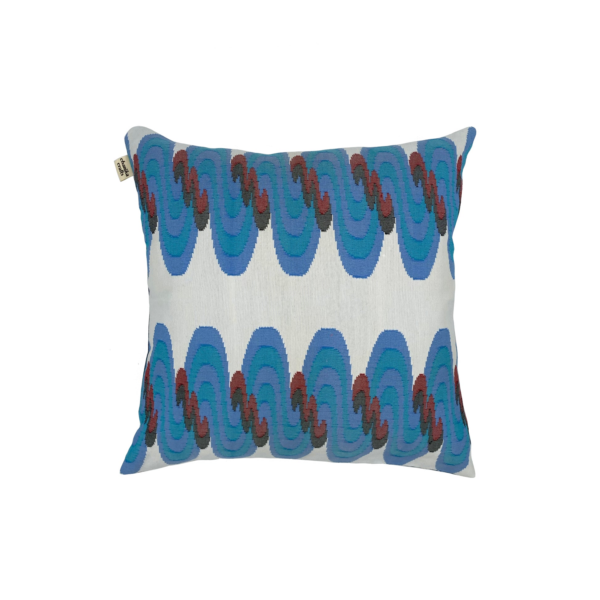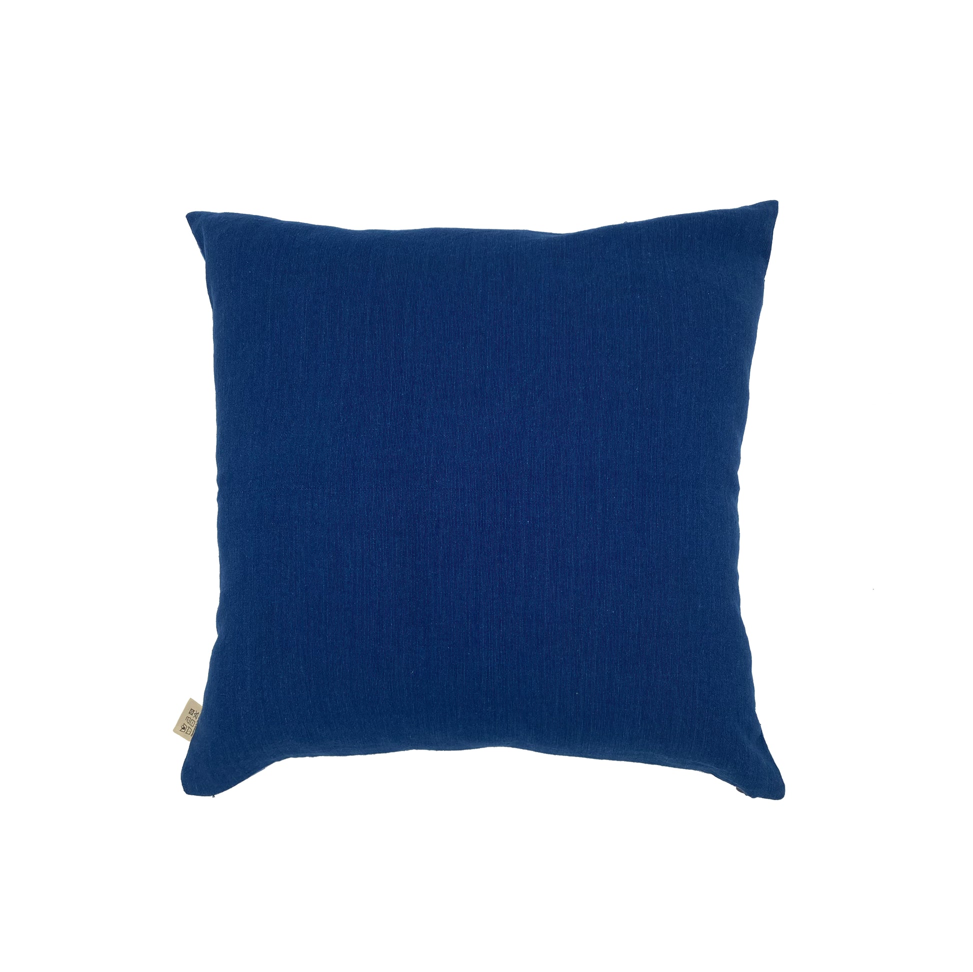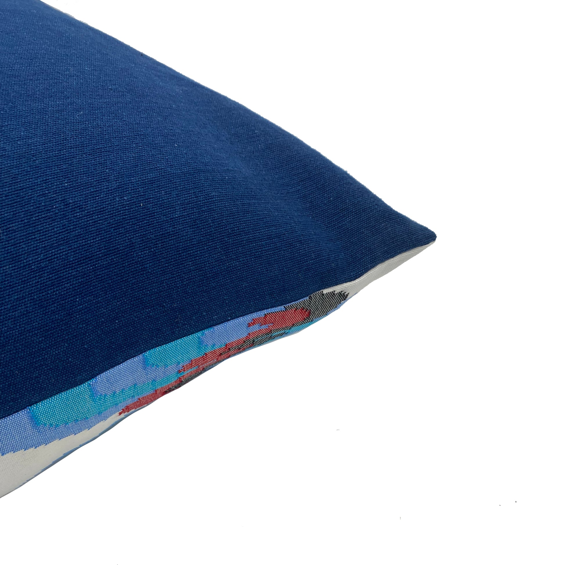 A contemporary adaptation of the traditional Luntaya pattern from Myanmar, featuring simplified complexity and indigo handwoven fabric from Sakon Nakorn, Thailand on the back. This design is created to reduce the laborious nature of the original hundred shuttles process.