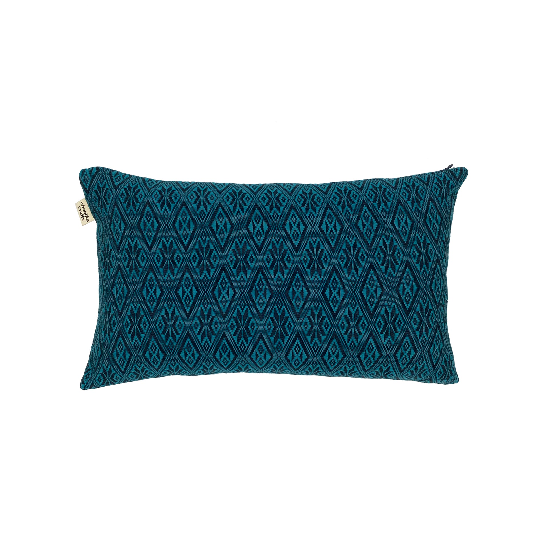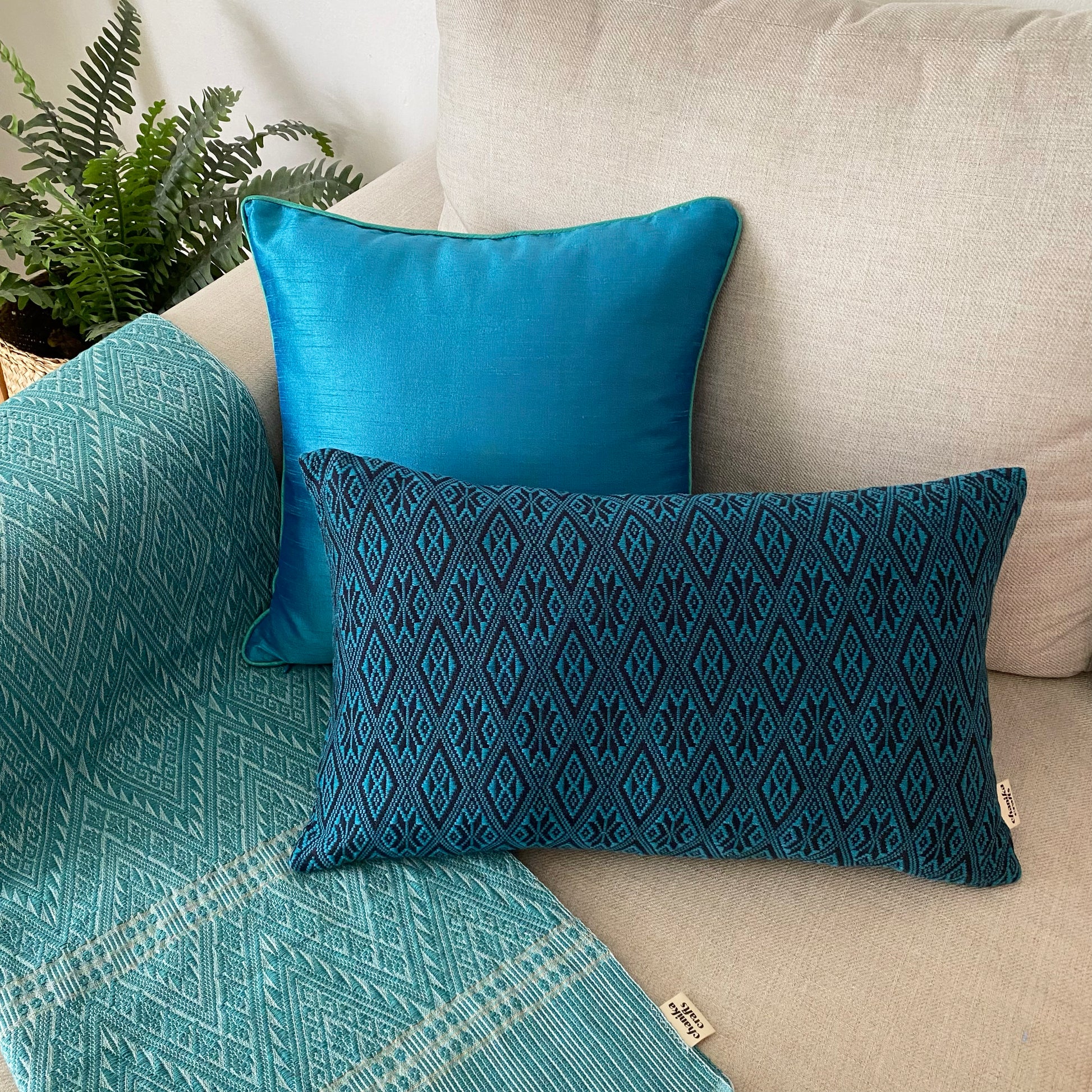 Khit weaving, also known as "ทอผ้าขิด" in Thai, is a traditional handcrafted technique that uses looms to create geometric patterns in contrasting colors. This style originates from Chaiyaphum province in North-East Thailand and involves weaving a light pattern over a black background, giving it a "floating" appearance. Our series includes 3 different color variations that can be transformed into pillow cases, making them a great addition to any space as a statement piece.